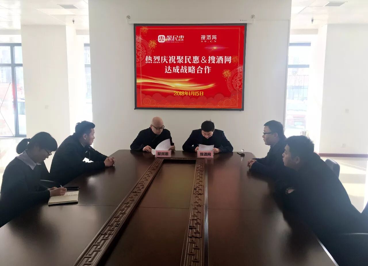 2018年1月15日上午,聚民惠与搜酒网全面战略合作协议签约仪式,在聚民惠唐山市运营服务中心举行。聚民惠集团总经理苏晓明代表集团林建松董事长,和搜酒网总经理程俊一起,代表双方企业,进行签约。